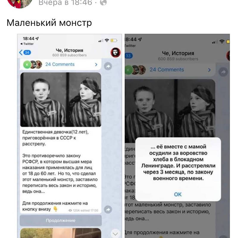 📍Таким образом, эту девочку убили дважды. Первый раз нацисты в Освенциме, а второй раз авторы телеграмм-канала, которые выложили это фото. Кстати, не знать, что делают, они не могли, поскольку отрезали низ фотографии с надписью "Аушвиц". Причем убивали при содействии тех, кто активно лайкал и репостил этот фейк (запись заняла второе место по репостам в России - кнопку "поделиться" нажали 338 раз).